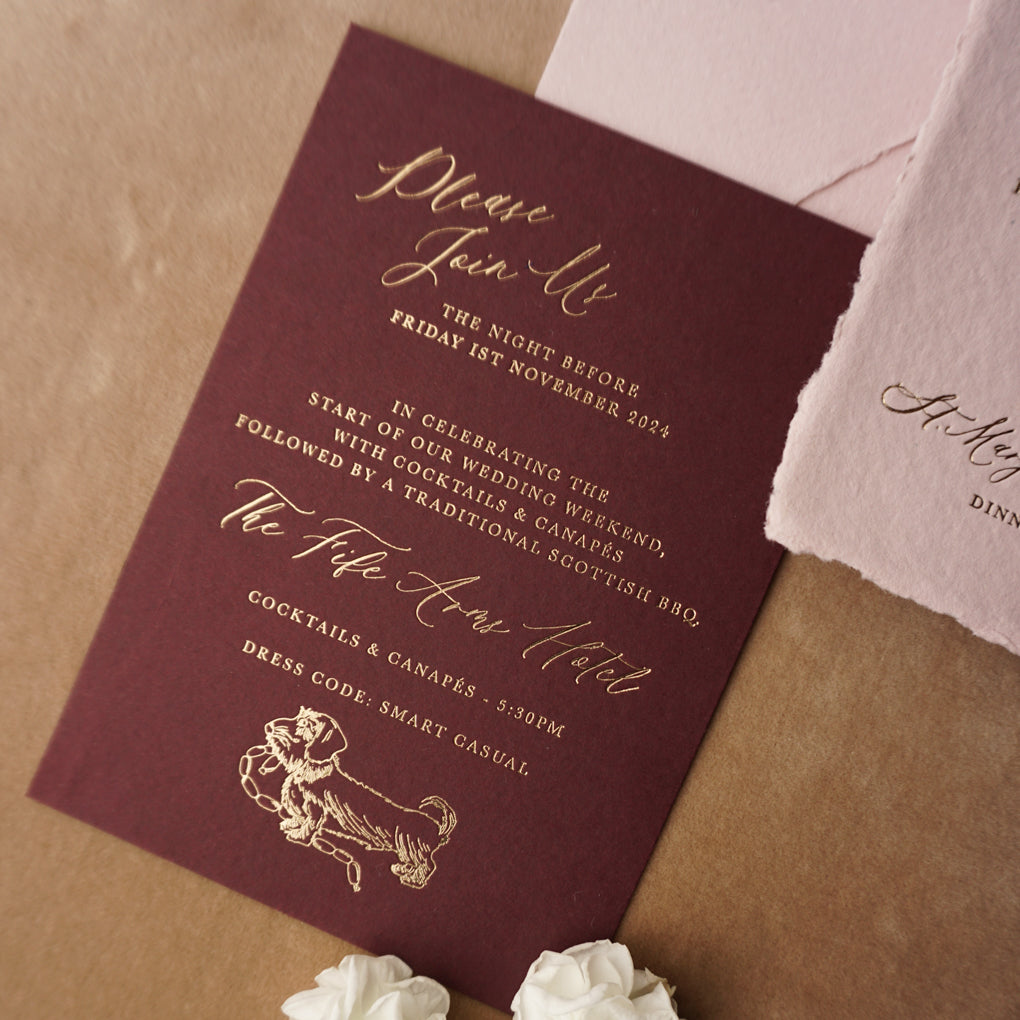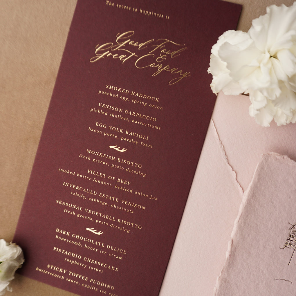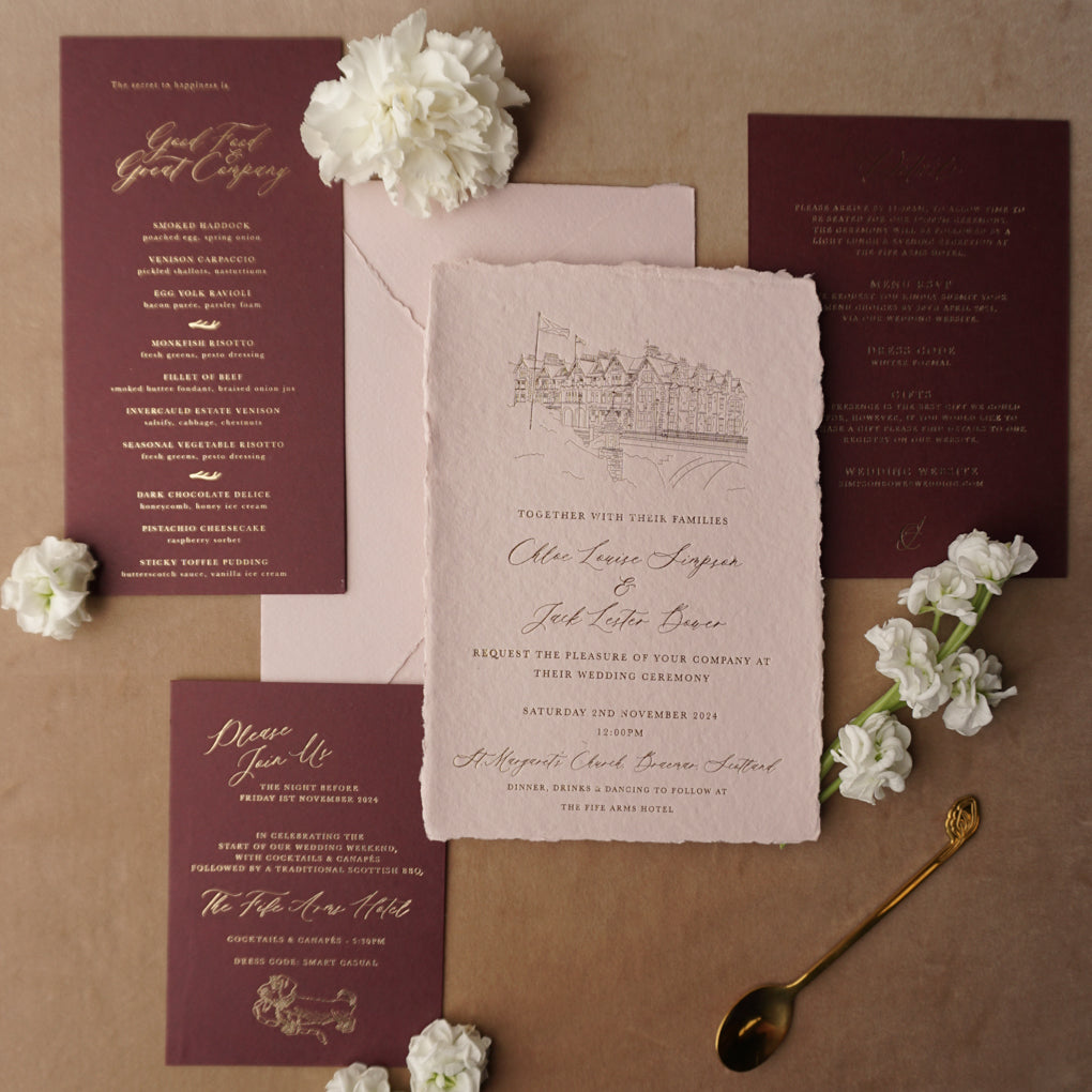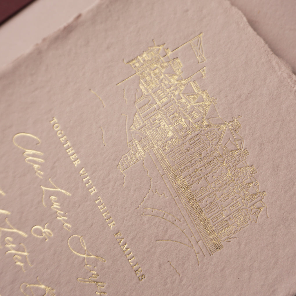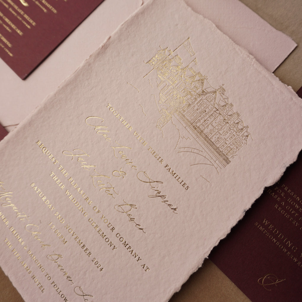 Blush handmade paper, burgundy card and gold foil illustrations come together here to create wedding invitations that feel personal, romantic and quietly opulent - the perfect first glimpse of your wedding day.