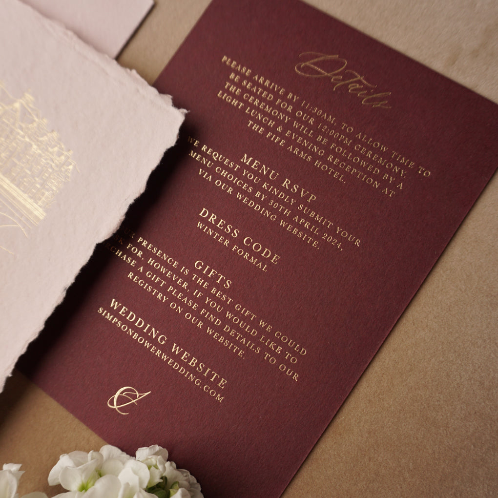 To complement the softness of the blush handmade paper, we’ve paired the invitation with deep burgundy card across the rest of the suite. Details cards, RSVPs and evening invitations are all printed on this smooth heavyweight stock, again using gold foil for a cohesive finish.