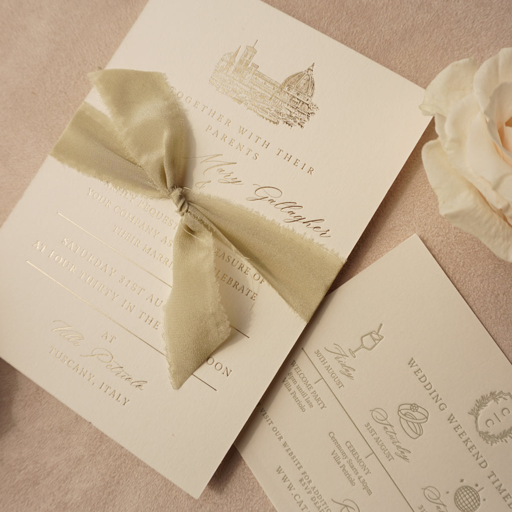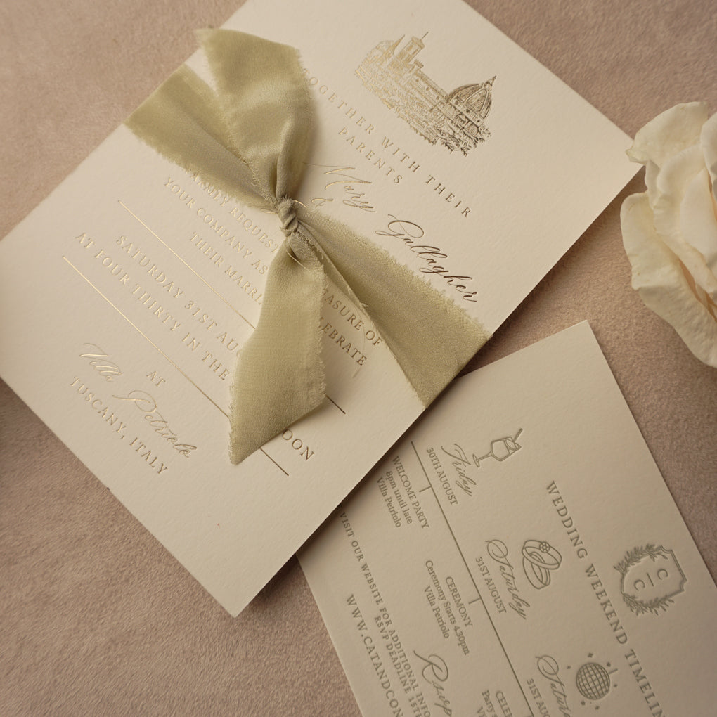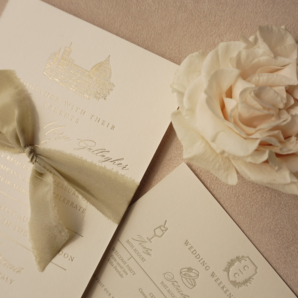 The main invitation is foil printed onto natural Colorplan card, chosen for its warm tone and beautiful weight. The foil adds a subtle luminosity, catching the light just enough to elevate the design while still feeling understated and timeless. Paired with traditional typography, the result is an invitation that feels formal yet welcoming, perfect for a romantic destination celebration.