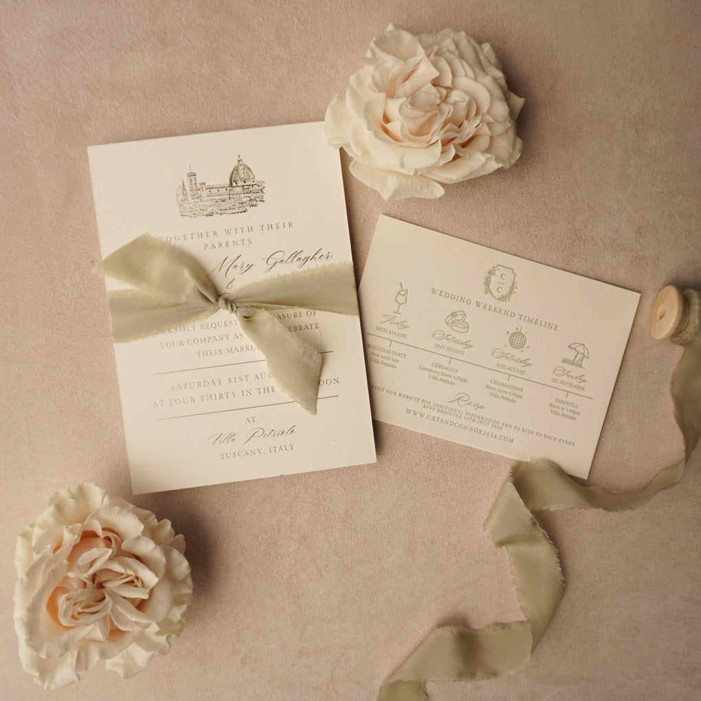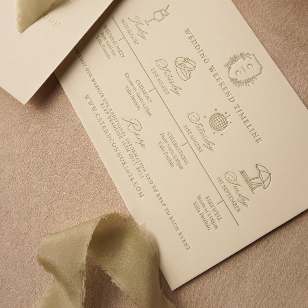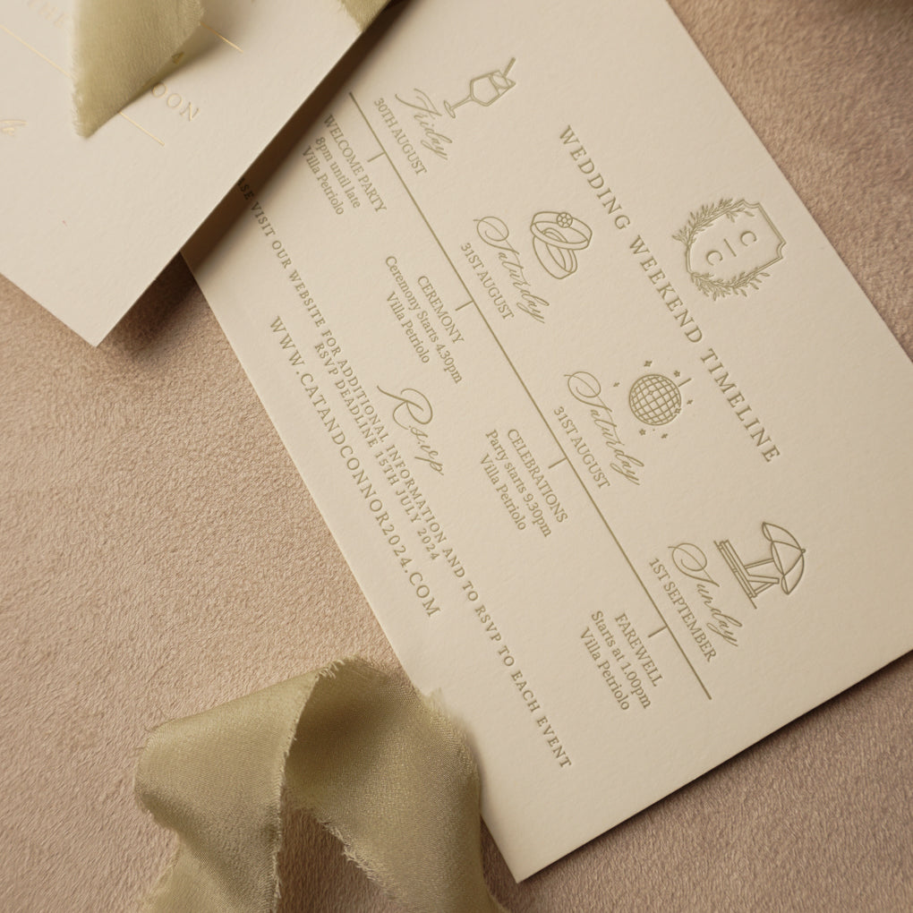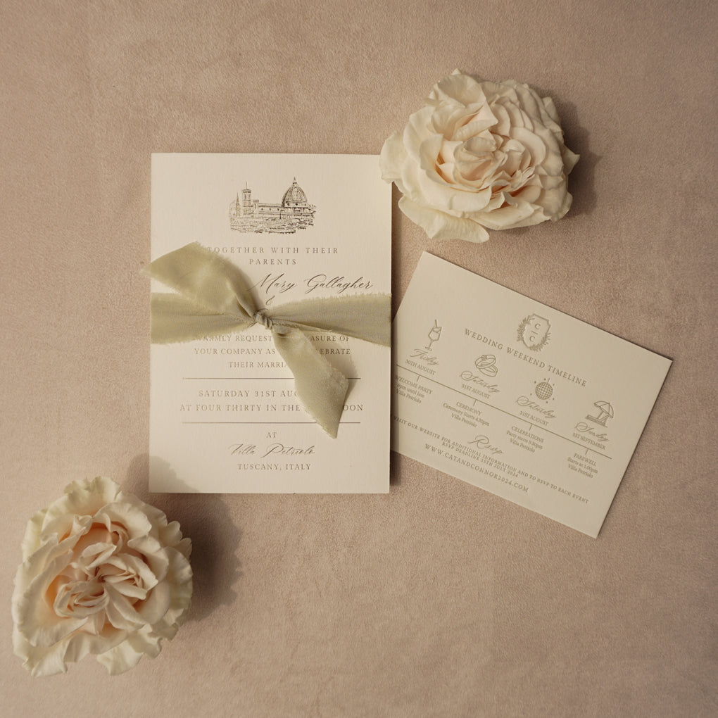The main invitation is foil printed onto natural Colorplan card, chosen for its warm tone and beautiful weight. The foil adds a subtle luminosity, catching the light just enough to elevate the design while still feeling understated and timeless. Paired with traditional typography, the result is an invitation that feels formal yet welcoming, perfect for a romantic destination celebration.