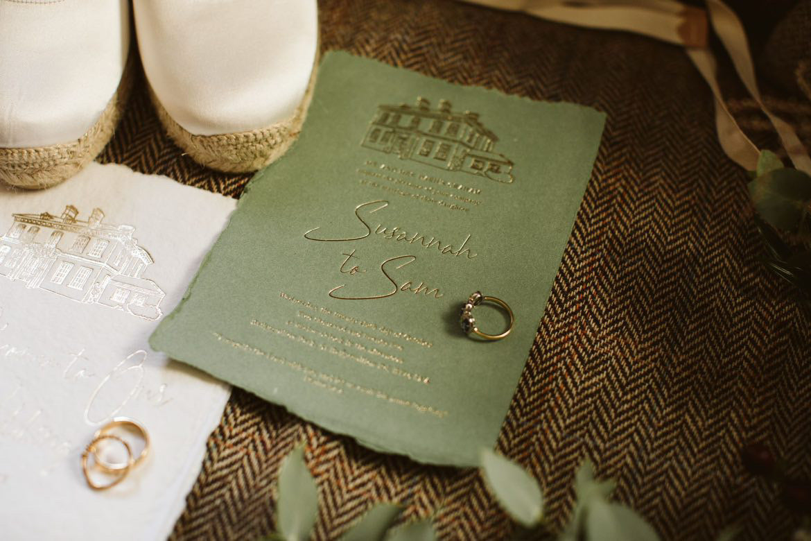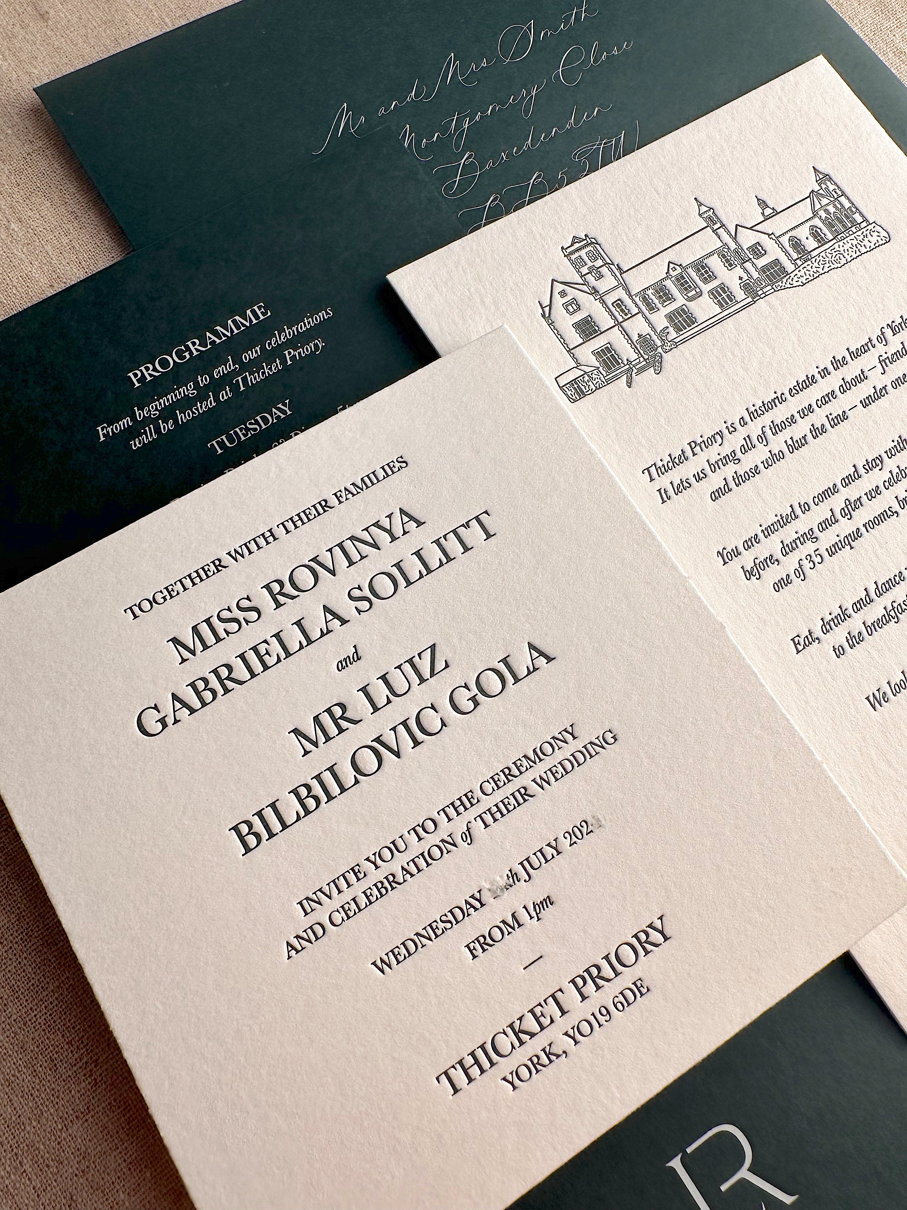 A diy brides creation with dark green letterpress to match the custom racing green envelope