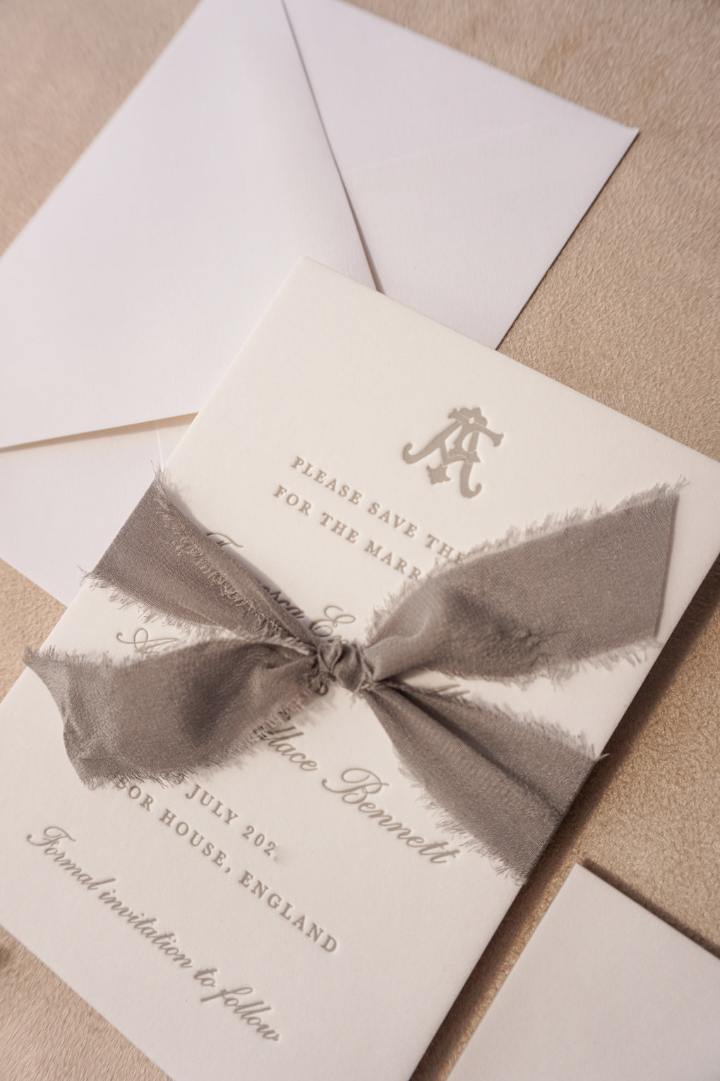 Grey letterpress on gmund cotton paper with dark grey ribbon